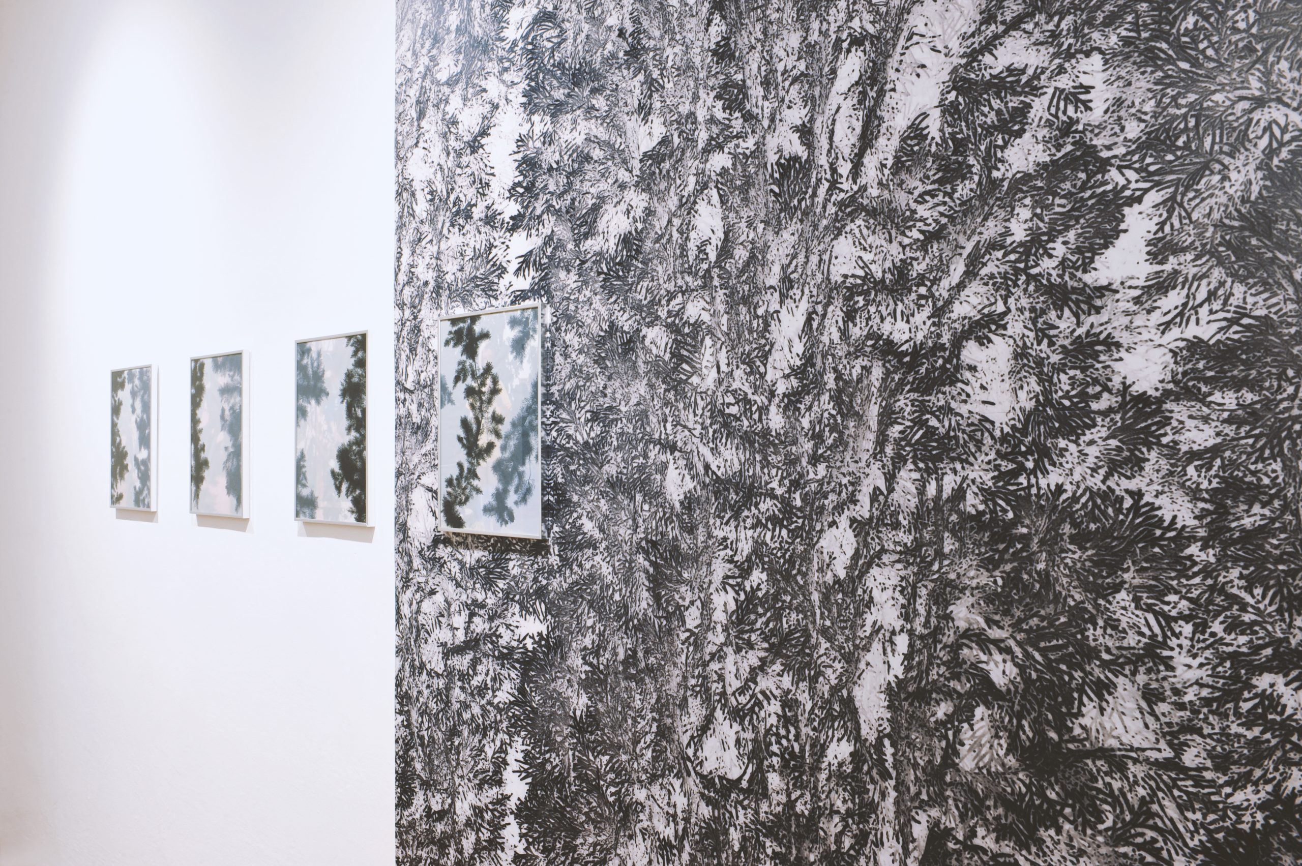 Tina Konec dedicated her most recent works to her grandmother, who, by planting trees around the house, in a way ensured that memories would be preserved for future generations. Cypresses, with their elegant, upright growth and longevity, carry deep meanings that have resonated with people for millennia. The works were created through the layering and overlapping of photography and drawing. Tracing paper, which allows the photographic image beneath to shine through the translucent surface, creates subtle transitions. Drawing and photography enter into both a visual and conceptual dialogue. By confronting two mediums – two images from different temporal layers – the artist constructs symbolic meaning on multiple levels. On one hand, photography functions as memory and an association with reality; on the other, drawing introduces a subjective, personal interpretation of that same memory. The viewer is invited to reflect on the relationship between the objective and the subjective, the external and the internal. Through layering, a dialogue emerges between past and present, raising questions of personal identity, personal history, and memory.